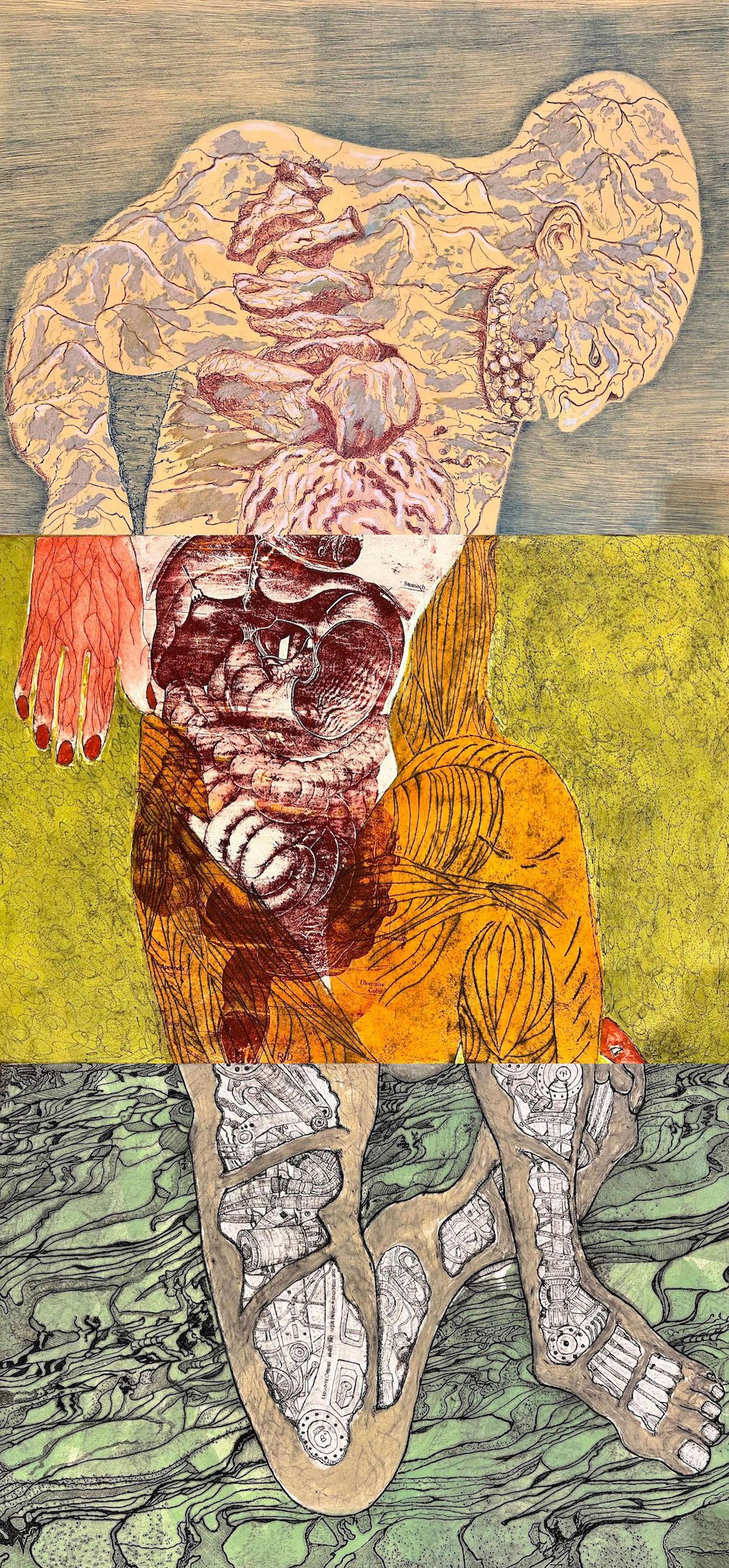 Exquisite Corpse 2- “Corpse Unveiled”, Head- Bill Jaros, Drypoint, Torso- Christina Yasmin Fesmire, Drypoint, Hip- Nguyen Ly, Collagraph, 45” x 22”, 2021.